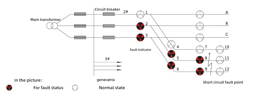 Na podlagi značilnosti pojava kratkega stika se kot merilo ukrepanja uporablja nenadna sprememba toka med kratkim stikom, ki jo spremlja izpad električne energije zaščitne naprave. Metoda razlage za diagram indikacije napak je naslednja: Ko indikatorske lučke 2, 5 in 8 faze A linije 2, nobena indikatorska lučka na fazi B, indikatorske lučke 3, 6 in 9 faze C vse svetijo rdeče, medtem ko indikatorski lučki 11 in 12 ostaneta beli, je mogoče ugotoviti, da je prišlo do napake kratkega stika na tej točki izhodnega voda.